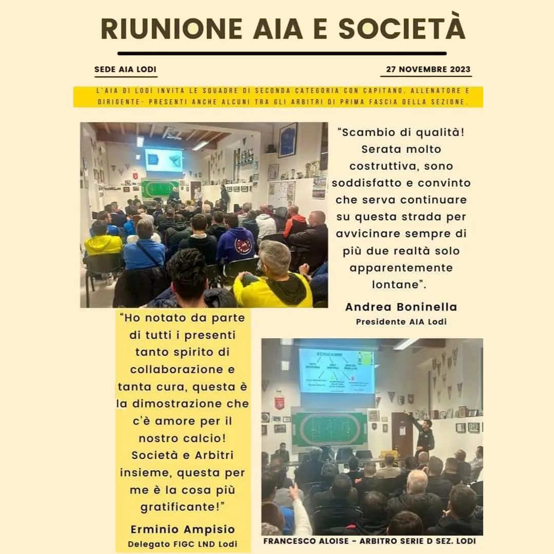 News 8 dicembre 2023 La nostra Sezione impegnata Lunedì 27 Novembre e Giovedì 30 in riunione con le Società di Seconda e Terza Categoria. Due serate molto costruttive, presenti diversi nostri Arbitri insieme ad Allenatori, Capitani e Dirigenti. ← Raduno Arbitri Eccellenza e Promozione Buone Feste! →